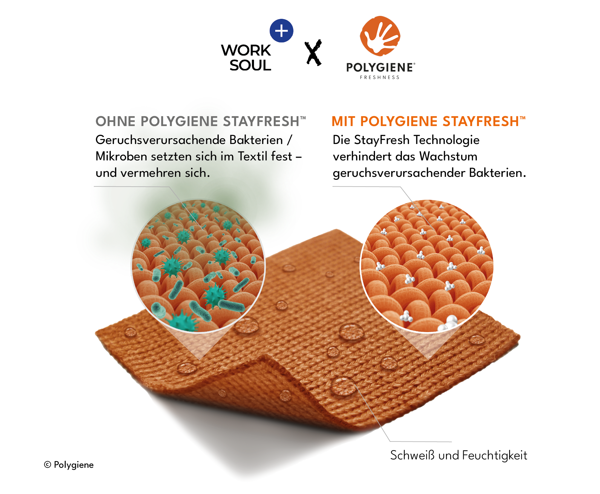 Technologie StayFresh™ von POLYGIENE®. Das schwedische Unternehmen ist weltweit führender Anbieter für Geruchskontrolltechnologien und antimikrobielle Lösungen. Produkte, die mit der langlebigen Technologie ausgerüstet sind, bleiben länger angenehm frisch & hygienisch. POLYGIENE® StayFresh™ bleibt auch nach dem Waschen wirksam und die perfekte Lösung zur Vorbeugung und Reduktion geruchsverursachender Bakterien.